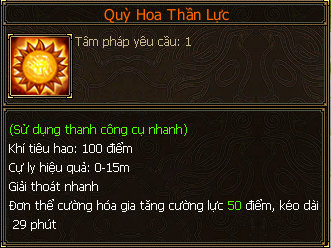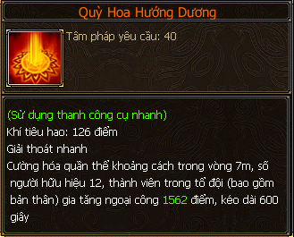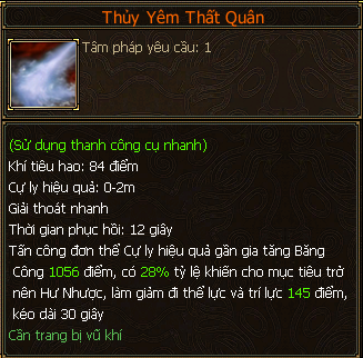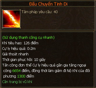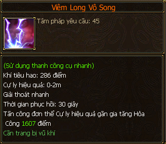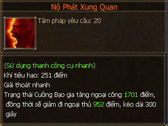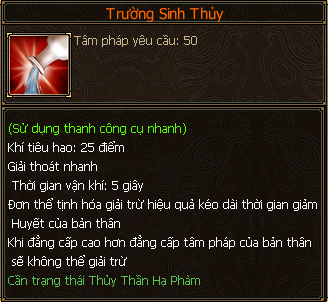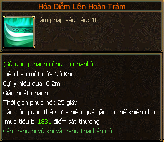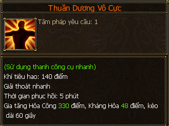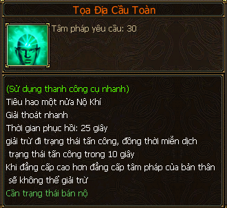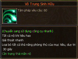Đặc điểm thú vị: hồi chiêu nhanh, có thể triệt tiêu nộ khí của đối phương, có thể hóa giải trạng thái mất máu liên tục do Cửu Âm Bạch Cốt Trảo của Nga My gây ra.